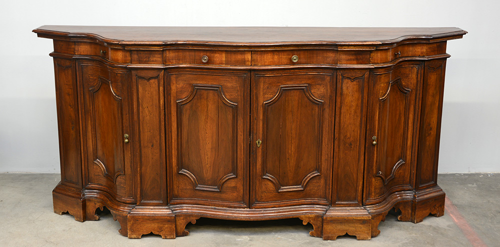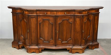 Credenza in noce di forma mossa decorata a cartelle profilate di forma sagomata, piedi a mensola. Assemblata con materiali antichi (cm 220x97,5x50) (difetti e restauri)
