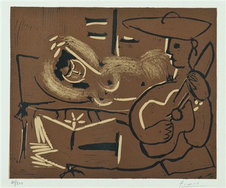 Pablo Picasso Femme coucheè et guitariste Linoleografia di cm. 27x32,5, su carta di cm. 30x36, es. 40/300 L'Opera è stata edita dalla Cercle d'art, Parigi, nel 1962, in 300 esemplari con il permesso di Pablo Picasso e la Galerie Louise Leiris. Firma in basso a destra, tiratura in basso a sinistra. Certificato di Provenienza di Alberto Lanteri su carta semplice.