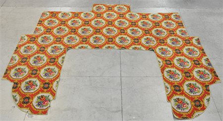 Tappeto meccanico a guisa di moquette, decorato con medaglioni ottagonali formati da mazzi di fiori in cornici dorate su campo rosso lacca. Il tappeto è stato dimensionato con una forma somigliante ad una U (cm 473x355) (difetti)