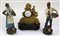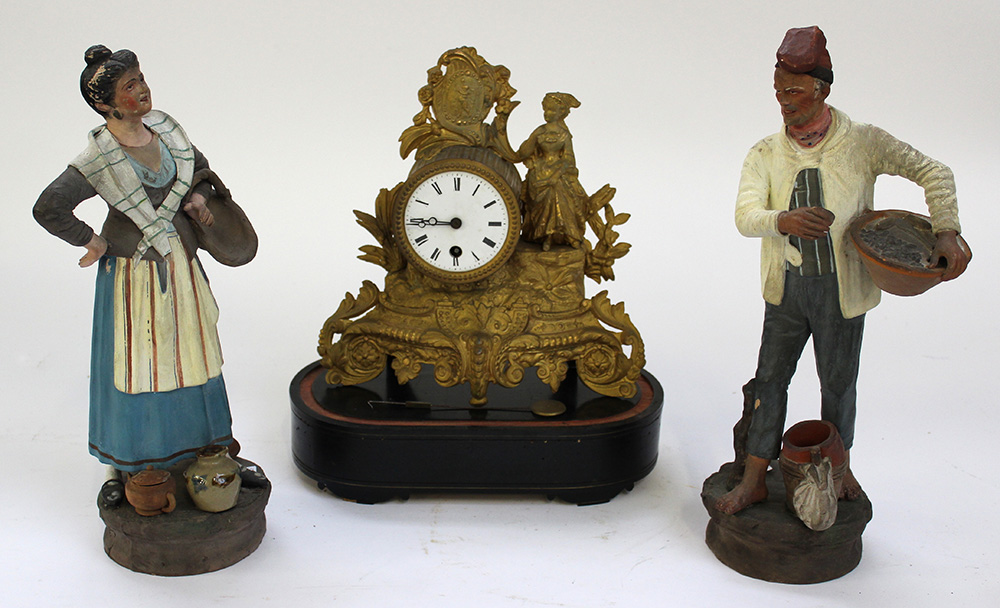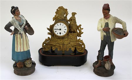 Lotto composto da due sculture in terracotta raffiguranti personaggi popolari e un orologio a pendola in metallo dorato
