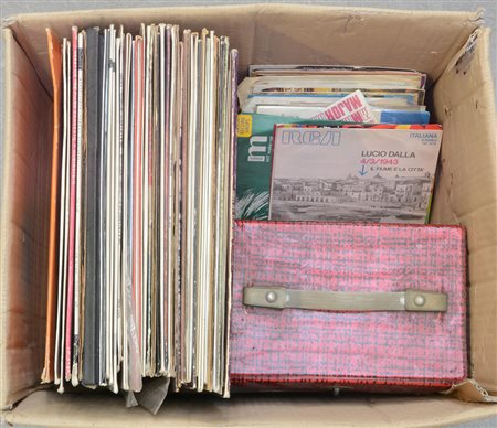 Cartone contenente numerosi dischi in vinile da 45 e 33 giri, anni...