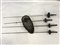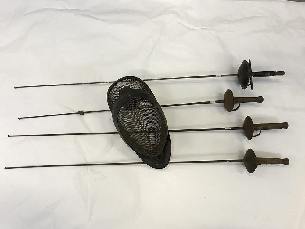 Lotto composto da quattro spade e un proteggi viso da scherma (difetti)