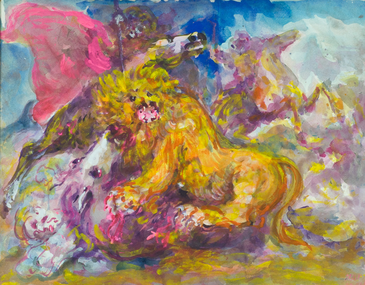 Aligi Sassu Caccia al leone, 1986 Tempera su carta intelata, cm. 42,5x54,5 Firma e data in basso a destra. Sul verso: firma, data e titolo; Timbro "Galleria Lisi", Roma; Timbro "Galleria Ghelfi", Montecatini Terme. Autentica dell'Artista su foto.