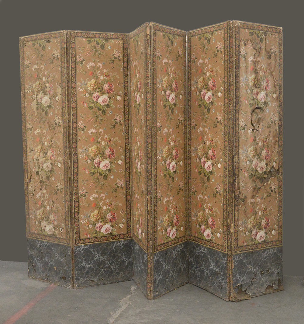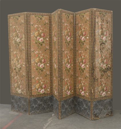Paravento a sei pannelli rivestiti in carta dipinta a motivi floreali con fascia inferiore decorata a finto marmo. Fine secolo XIX (cm 318x209) (difetti e mancanze)