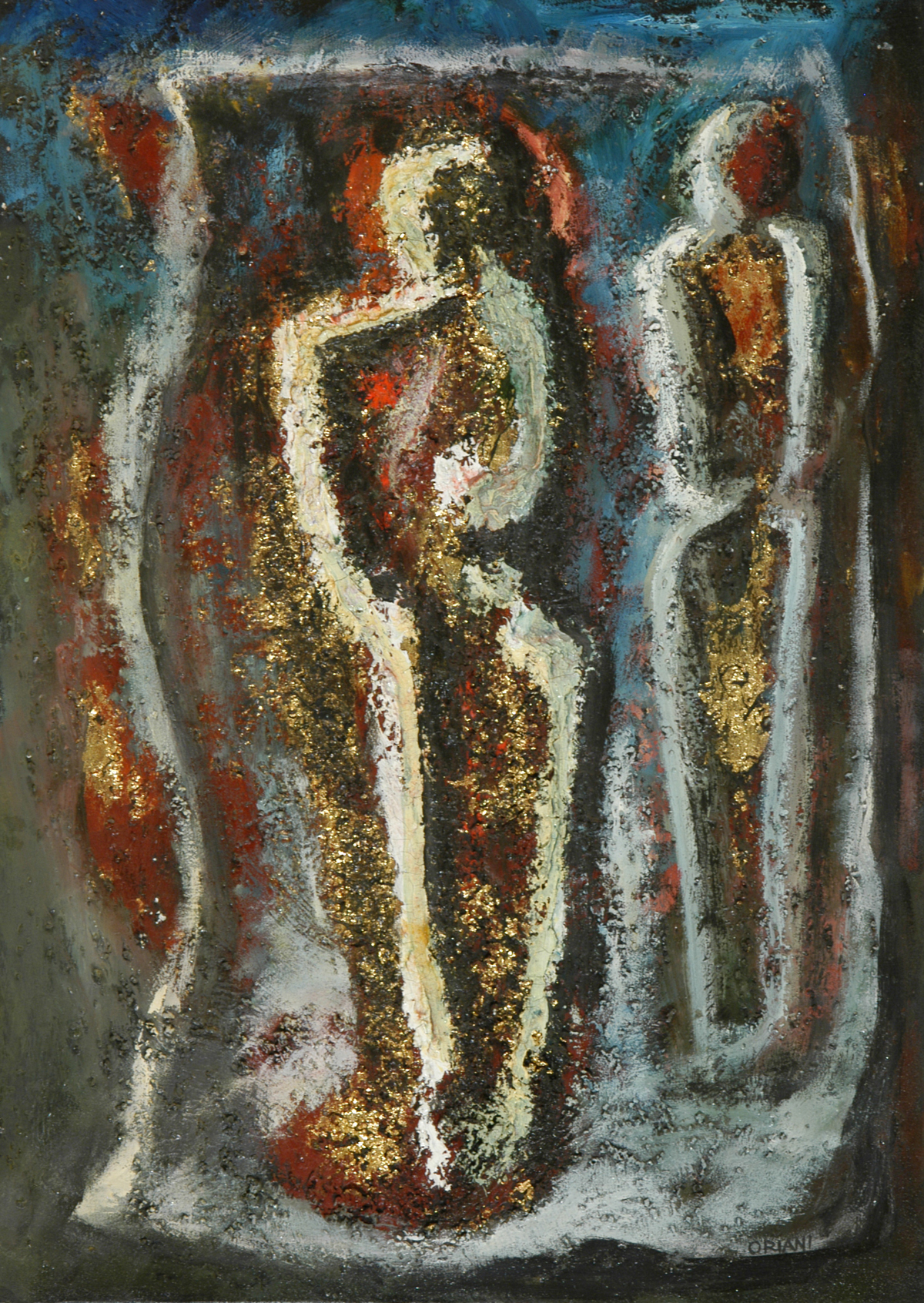 Pippo Oriani Presenza umana e struttura morfologica, 1967 Tecnica mista su tela, cm. 70x50 Firmato in basso a destra. Sul verso: firma, data, titolo e catalogo n° AS16. Autentica della "Fondazione Pippo Oriani" su foto, con timbro, firma e Archivio n° MV - 449.