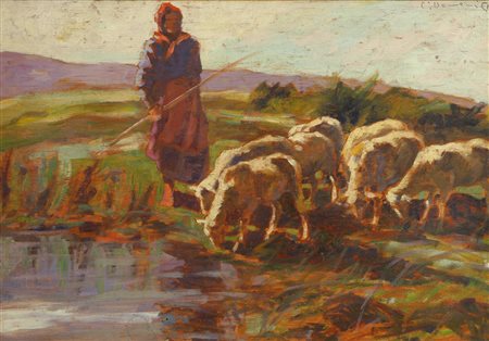 Carlo Domenici La pastora, metà anni '20 Olio su compensato, cm. 34,5x49,5 Firmato a matita nel colore in alto a destra. Sul verso: timbro "Galleria d'Arte San Barnaba", Milano. Bibliografia: Paolo Fabiani, "Carlo Domenici", pag. 118 - 119.