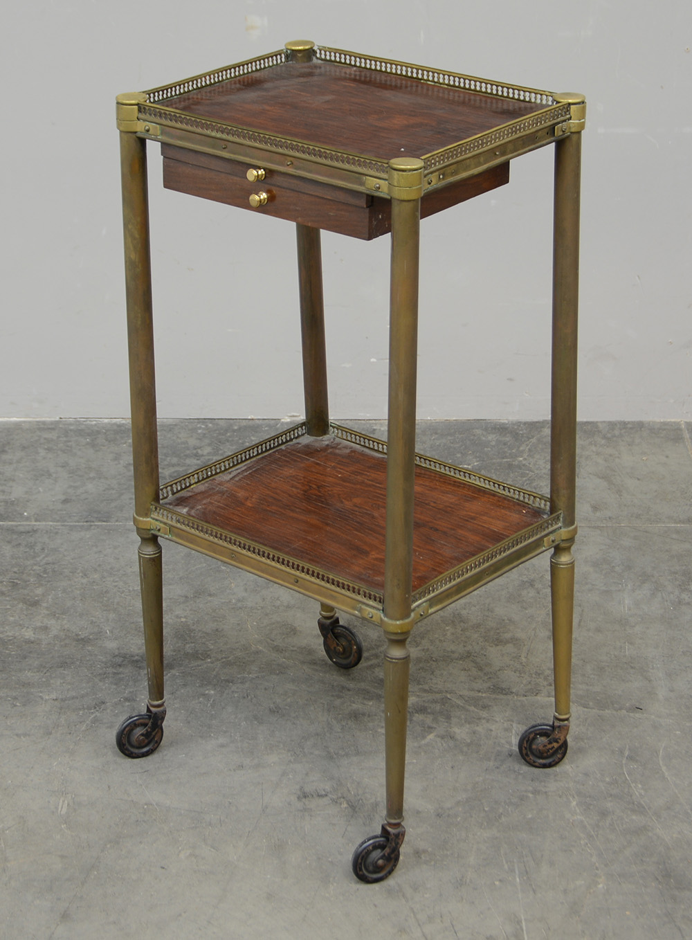 Piccolo carrello etagere a due ripiani con cassettino e pianetto estraibile in legno e ottone (cm 35x71x28). (Difetti).