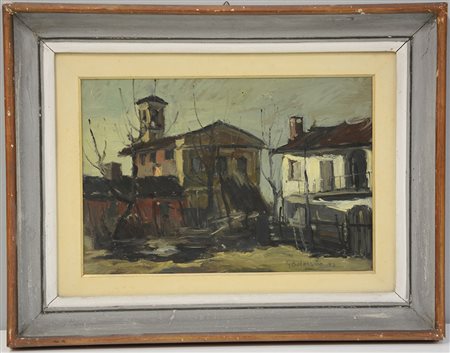 "Casolari" olio su masonite (cm 31x44) firmato e datato in basso a destra. Iscritto al reto, in cornice