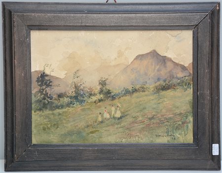 "La passeggiata"1924, acquerello su carta (cm 24x33) Firmato e datato in basso a destra. In cornice (difetti)