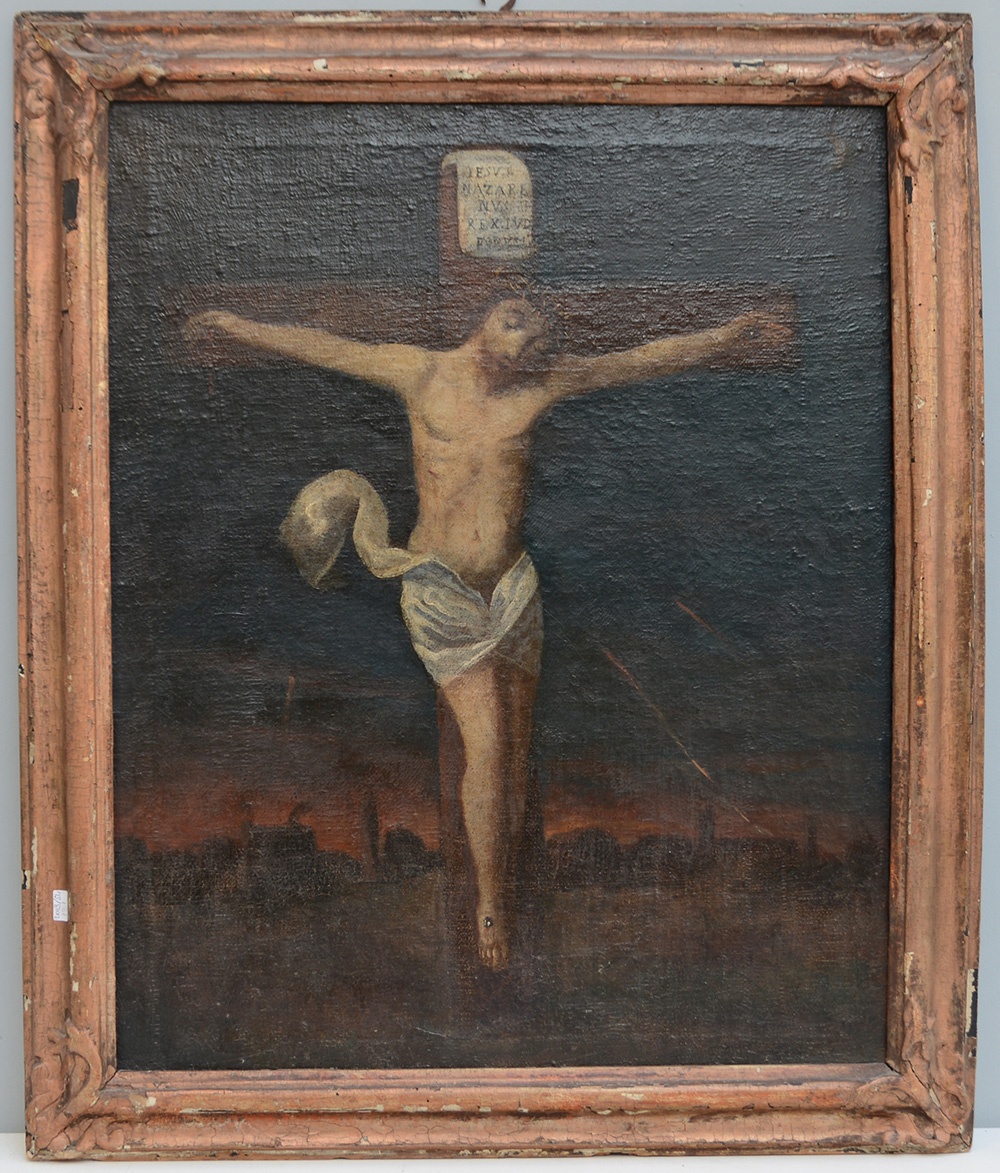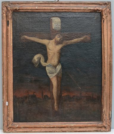 Ignoto del secolo XVIII "Cristo crocifisso" olio su tela (cm 72x58). In cornice antica (difetti e restauri)