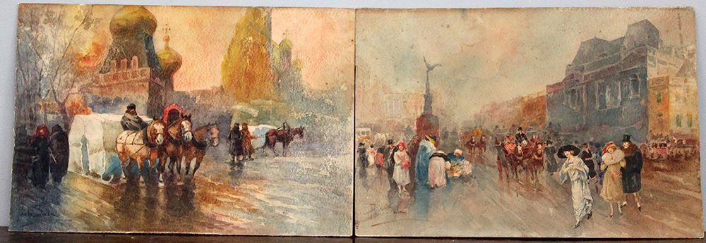 "Scorci di città con figure e carri" coppia di acquerelli (cm 33x50) Firmati in basso a sinistra (difetti)