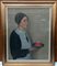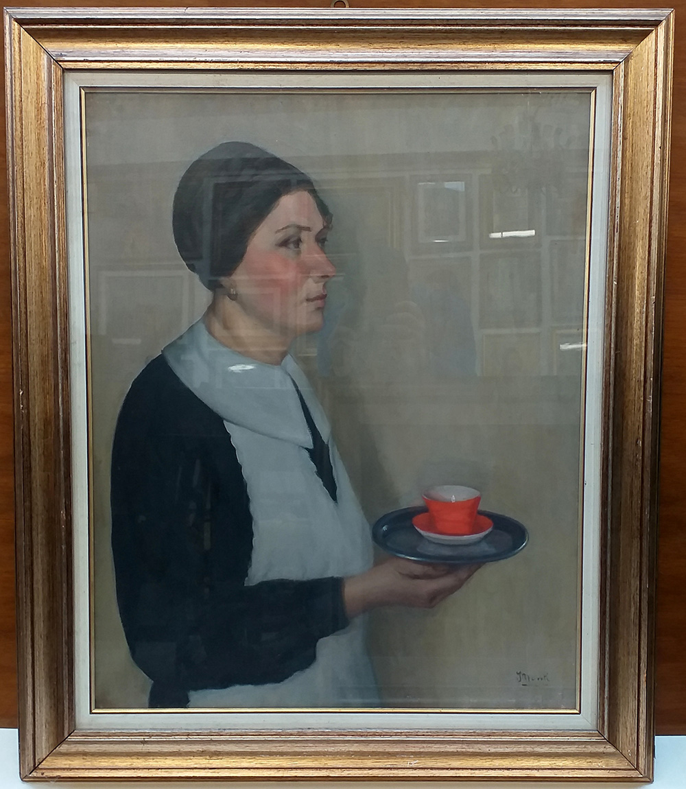 Firma indecifrata "Cameriera con vassoio e tazzina" olio su tela (cm 76x60) Firmato in basso a destra. In cornice
