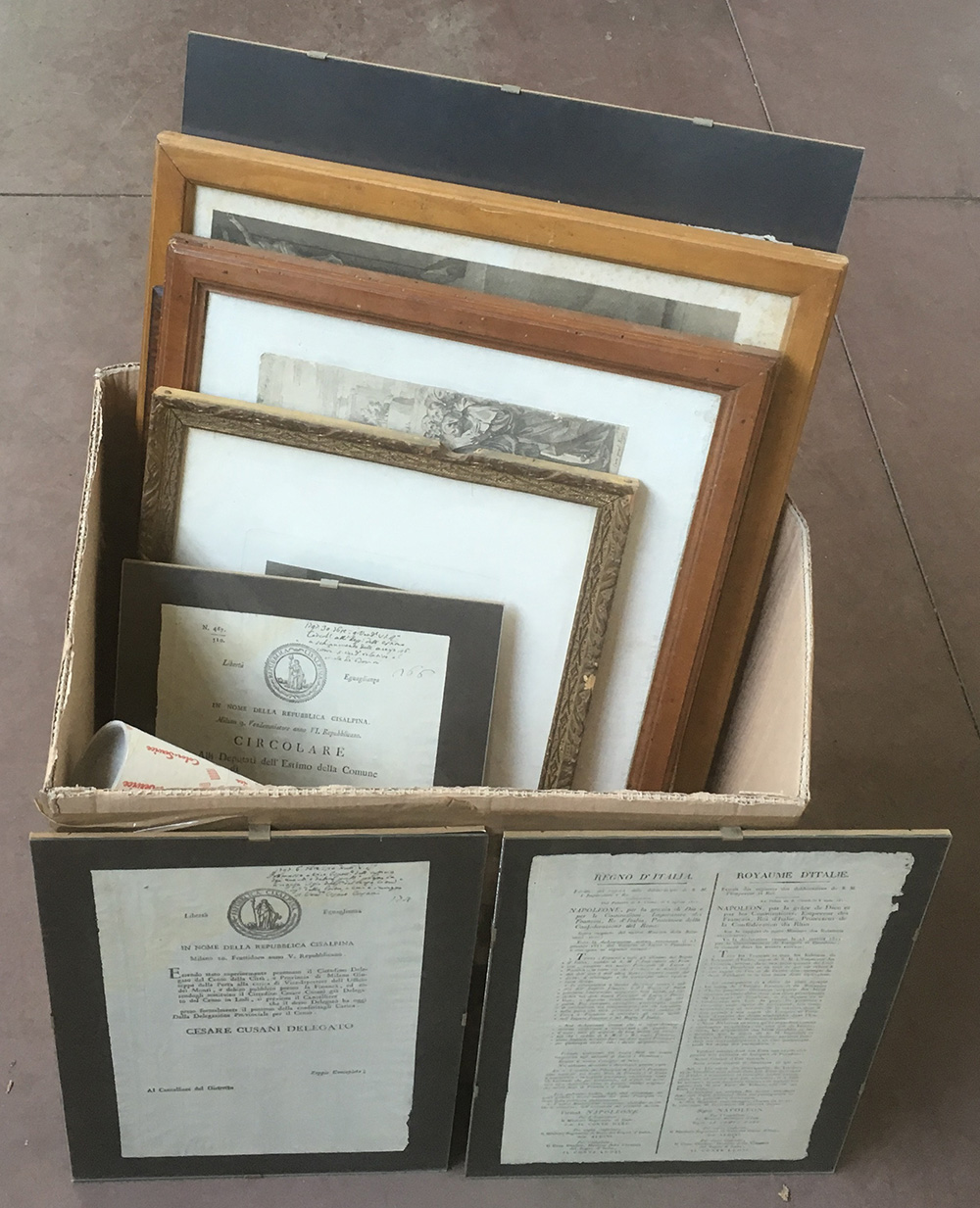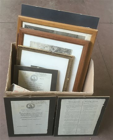 Cartone contenente antichi avvisi pubblici e incisioni di differente soggetto, in cornici (difetti)