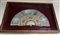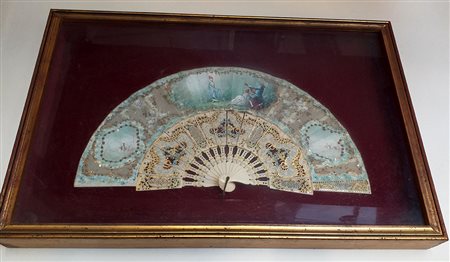 Ventaglio con pagina decorata a scena galante e paillettes, stecche in avorio traforato, in teca. Secolo XIX. (Difetti).
