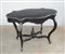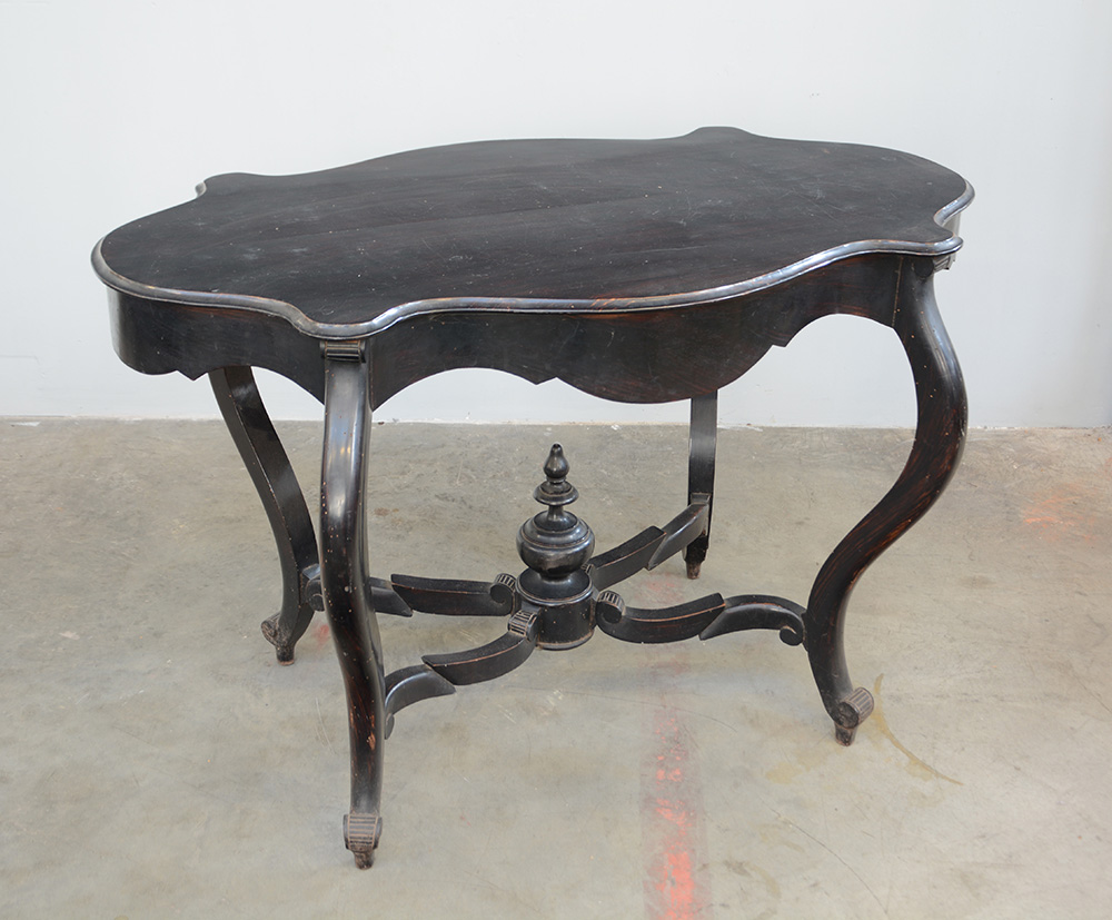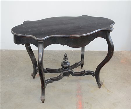 Tavolo a biscotto con gambe sagomate riunite da traverse centrate da elemento decorativo tornito. Secolo XIX (cm 119x68x72) (difetti)