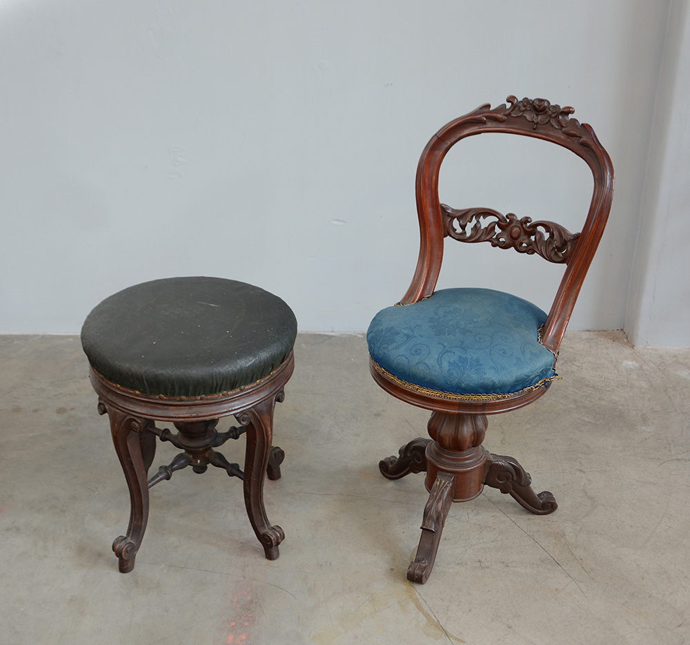Lotto composto da due sgabelli da pianoforte con seduta regolabile in...