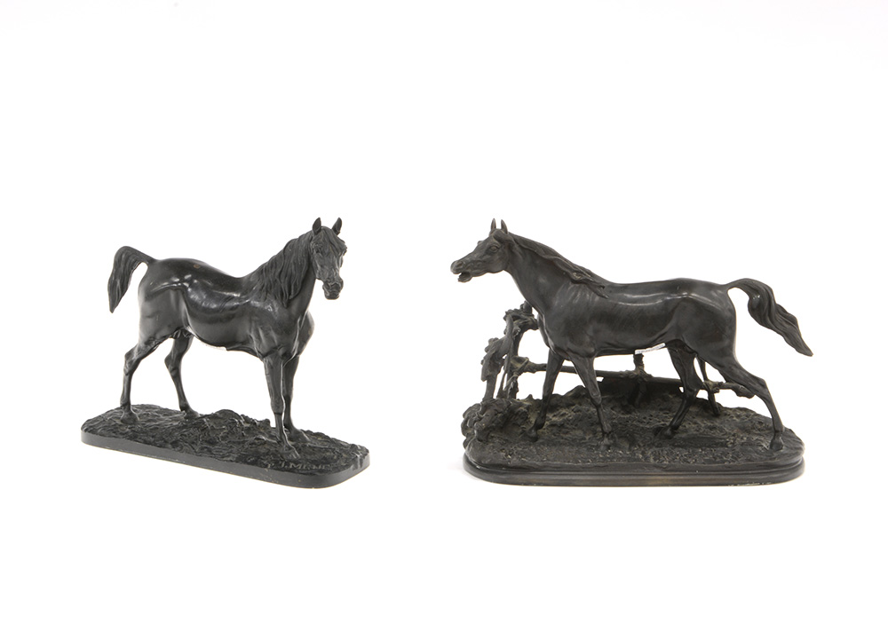 "Ibrahim - Stallone arabo" e " Cheval à la barrière" due scultura in bronzo a patina scura (cm 19,5x21,5 / cm 19x25) Firmate alla base. Fusioni postume (difetti)