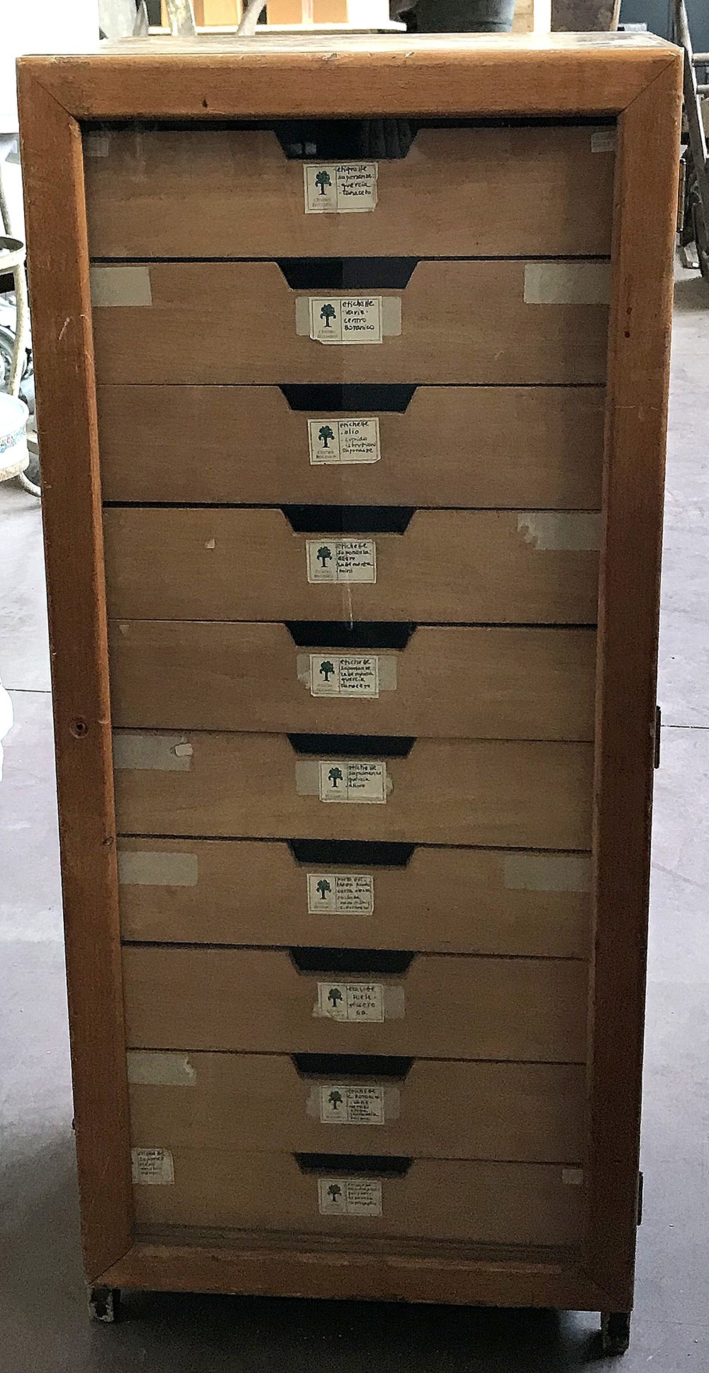 Mobiletto a dieci cassetti con anta in legno e masonite. Produzione recente....