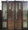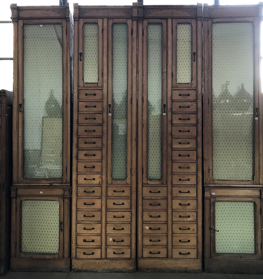 Parte centrale incompleta di grande armadio liberty a cassetti e piccole ante con cimasa intarsiata a motivi vegetali unita a due parti laterali ad un anta vetrata. Prima metà secolo XX. (cm 200x297x50) (difetti e mancanze)