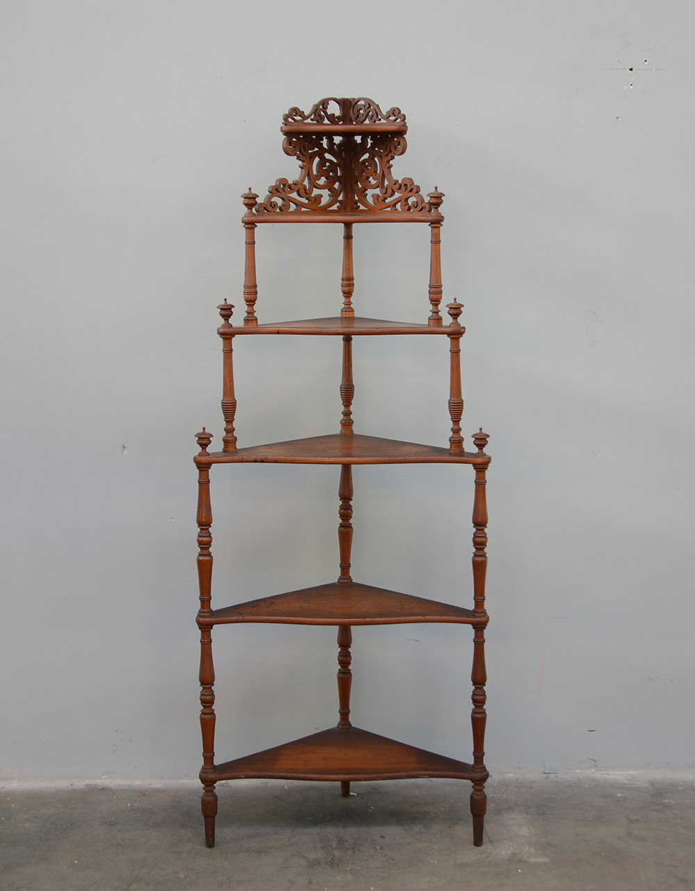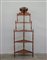 Etagere ad angolo con sei ripiani sagomati e montanti a colonna terminanti da pinnacoli torniti. Secolo XIX (cm 57x150x34) (difetti)