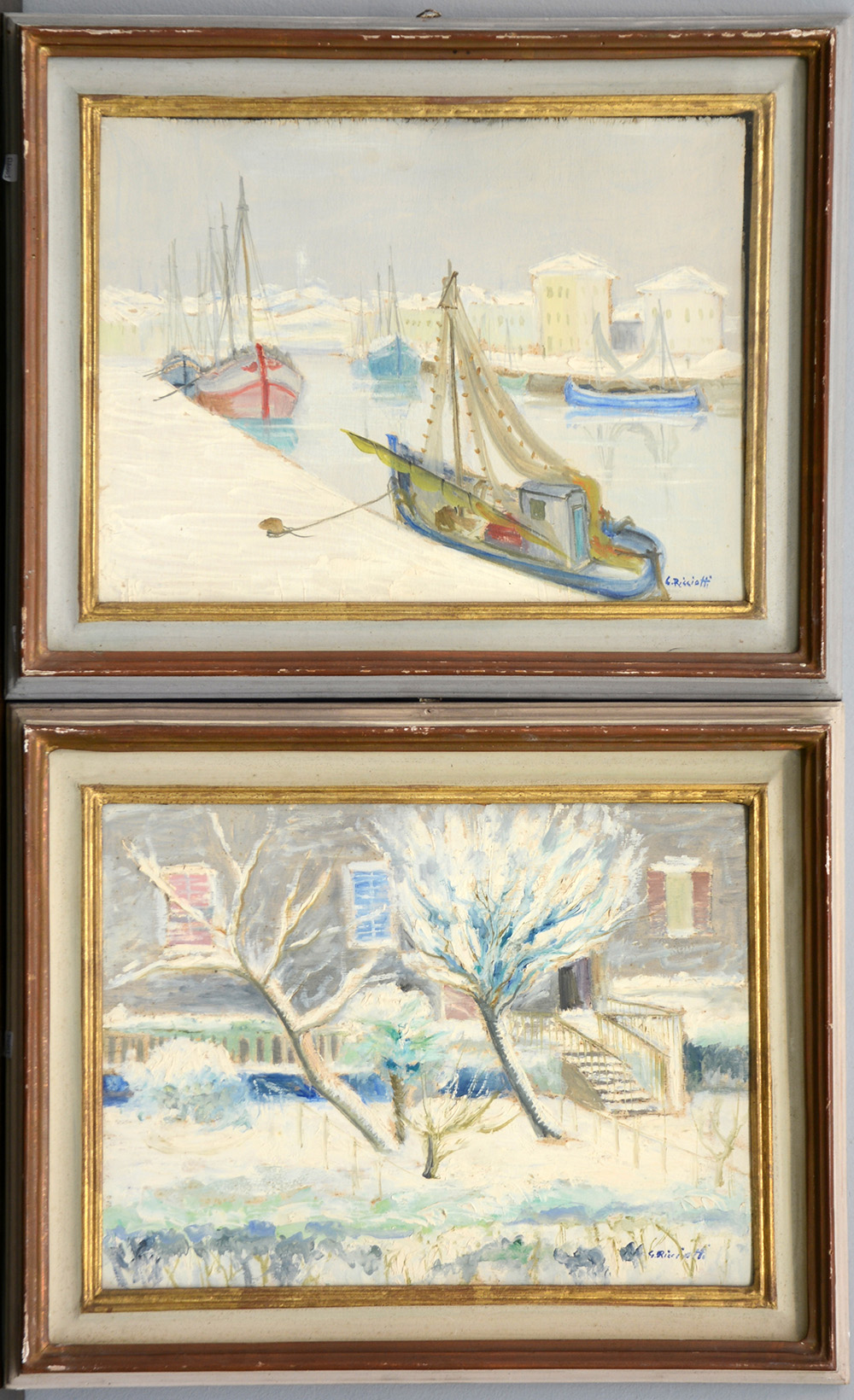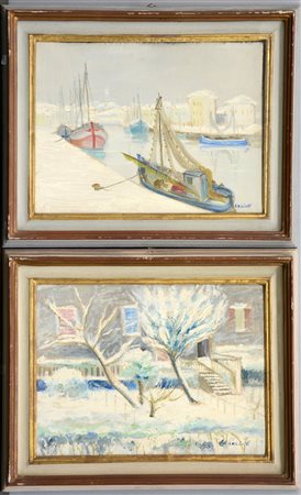 "Paesaggi innevati" coppia di olii su compensato (cm 30x40) firmati in basso a destra, in cornici