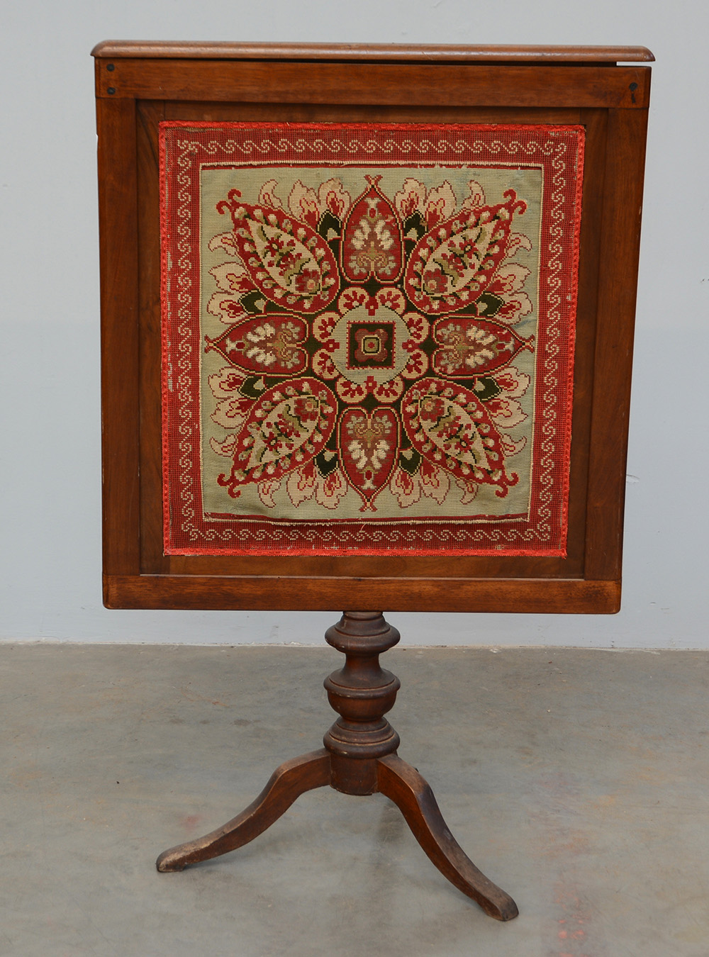 Parascintille in stoffa decorata a piccolo punto, struttura in legno (h. cm 120) Secolo XIX (difetti)