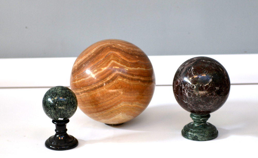 Lotto di tre sfere decorative di marmi differenti delle quali due con supporto. (d max cm 30) (lievi difetti)