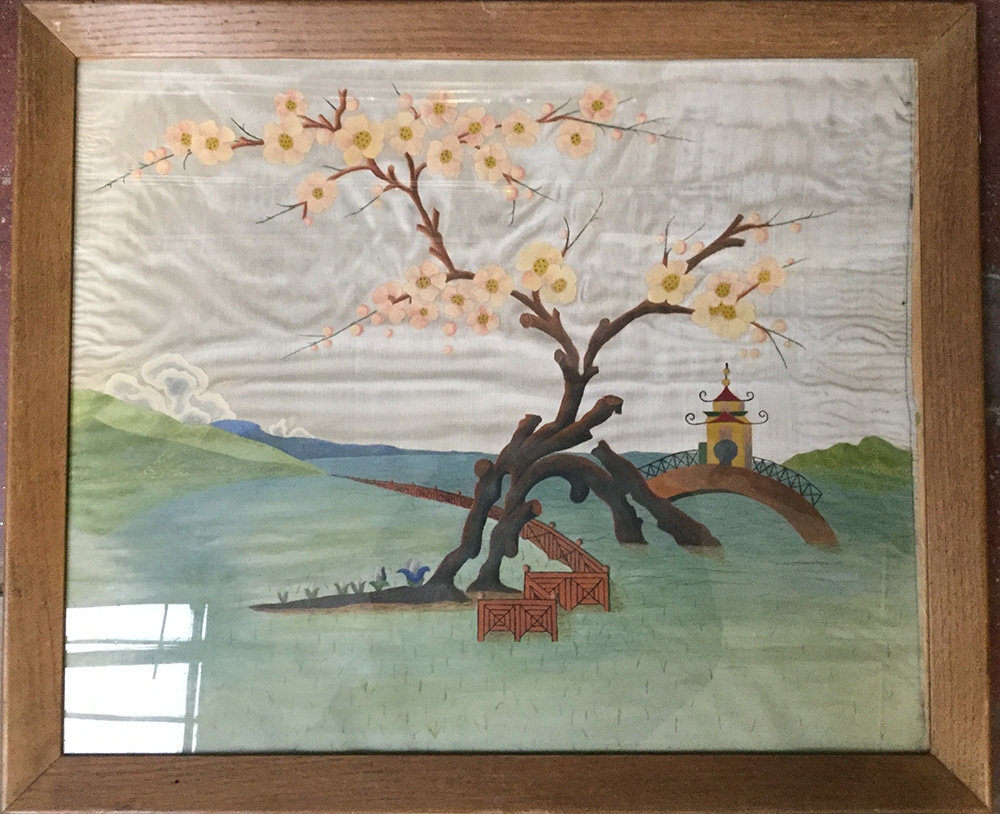 Arte orientale del sec. XX "Paesaggio con ponticello e pagoda" ricamo su seta...