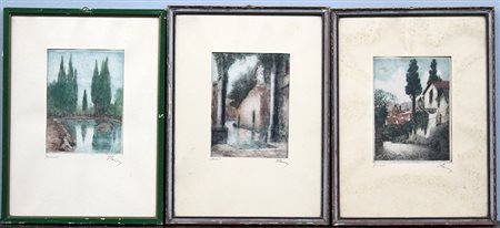 Lotto composto da tre litografie a colori raffiguranti paesaggi, in cornici