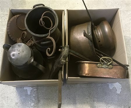 Lotto di due cartoni contenenti numerosi oggetti principalmente in rame (difetti)