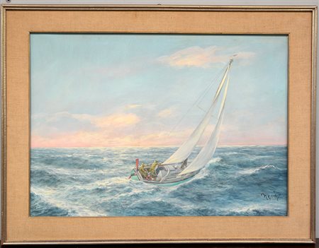 Firma indecifrata "Paesaggio marino con barca a vela" olio su tela (cm 50x70)...