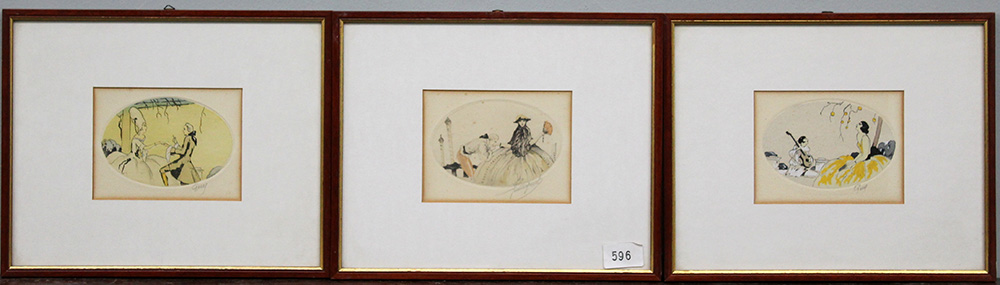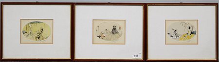 Gruppo di tre incisioni ovali colorate raffiguranti scene galanti. In cornice. (cm 10,5x14) (difetti)