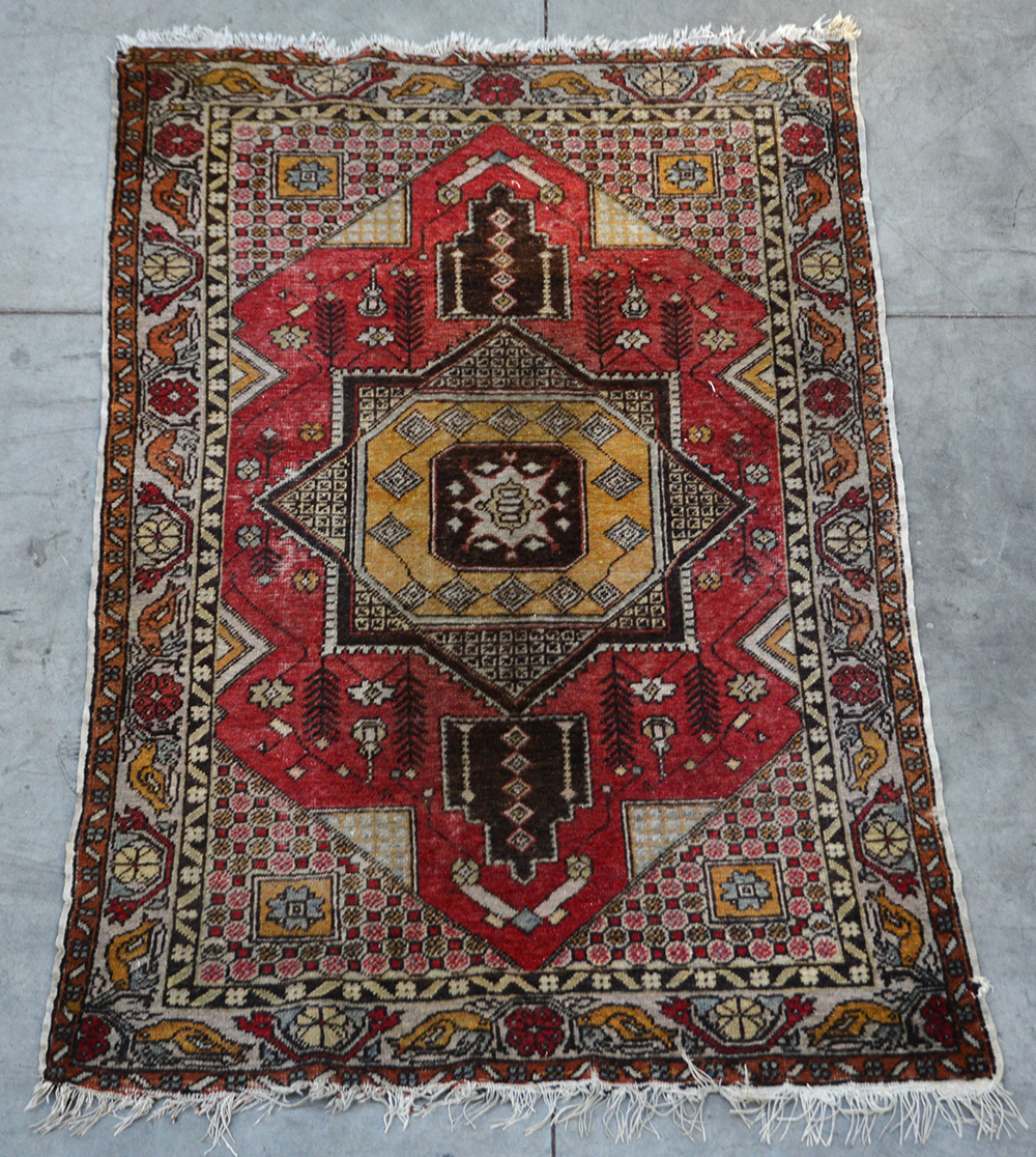 Tappeto Anatolico, inizio del secolo XX. Disegno con medaglione a stella con puntali nei toni del marrone ed ocra su fondo rosso (cm 168x106) (difetti)
