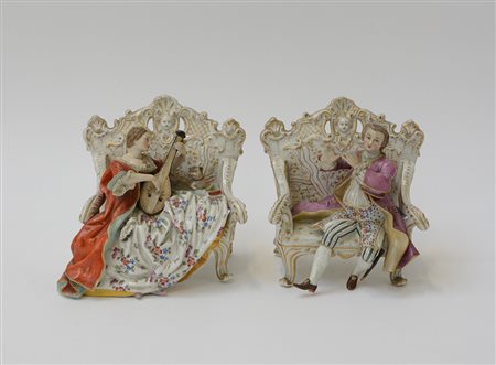 "Suonatori" coppia di gruppi in porcellana policroma e oro (difetti)