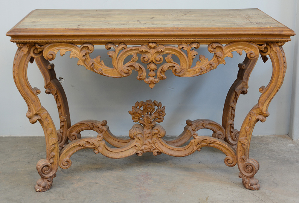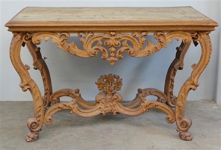 Consolle in legno intagliato e laccato con grembiale traforato, gambe mosse decorate a volute e riccioli riunite da traverse centrate da mazzo fiorito. Piedi ferini. Piano in legno laccato a finto marmo. Secolo XIX (cm 139x89x73) (difetti)