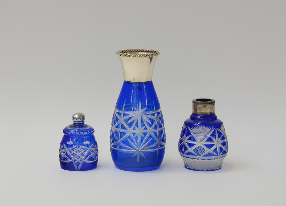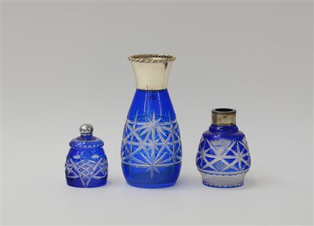 Manifattura di Boemia. Lotto composto da una bottiglia grande, una bottiglia piccola e una saliera in cristallo molato (difetti e mancanze)