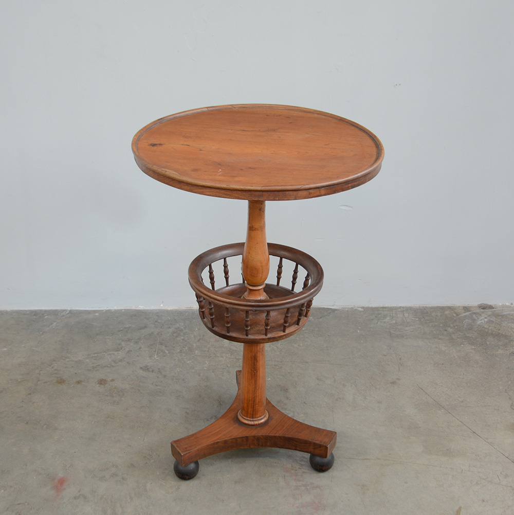 Tavolino etagere con piano circolare e portaoggetti a ringhiera tornita....