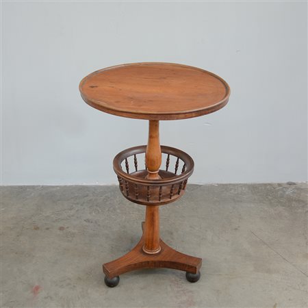 Tavolino etagere con piano circolare e portaoggetti a ringhiera tornita. Piedi ebanizzati (d. cm 50 x h. cm 69) Secolo XIX (difetti)