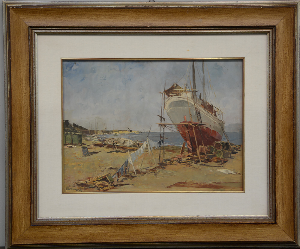 Ambrogio Vismara (1900 - 1994)"Marina con barche"Olio su compensato. Firmato...