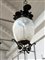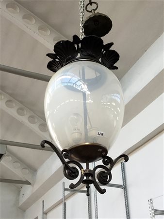 Lampada a sospensione a tre luci con struttura in metallo ed elementi decorativi in ghisa, paralume in vetro (difetti)
