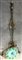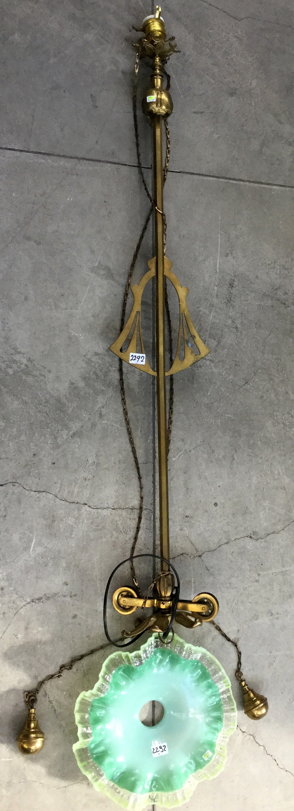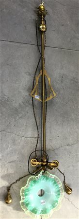 Lampada a sospensione a una luce con struttura in ottone decorata con carrucola e pesi, paralume in vetro verde soffiato a forma di fazzoletto (h cm 118) (difetti)