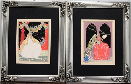 Coppia di incisioni colorate raffiguranti scene galanti. In cornici. (battuta...