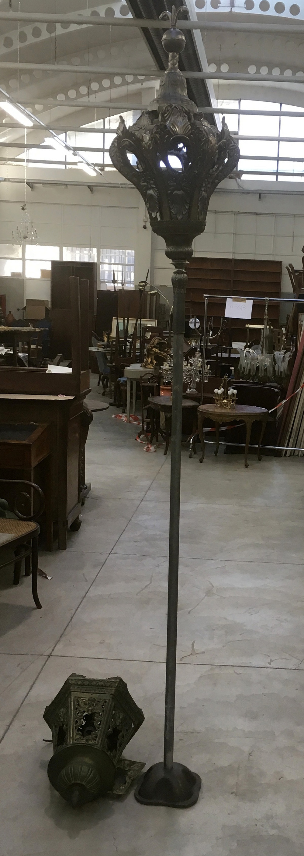 Lotto composto da un lampione con sostegno e una lanterna esagonale in metallo sbalzato (difetti e mancanze)