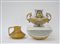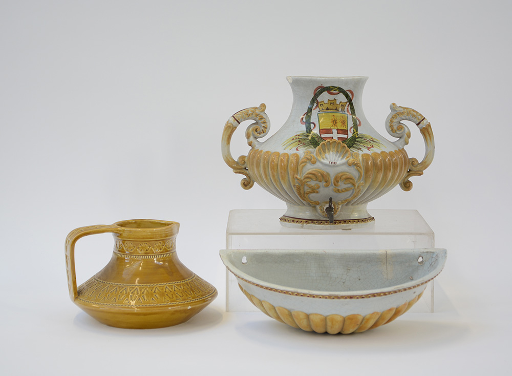 Manifatture diverse. Lotto composto da un'acquasantiera da muro e una brocca in ceramica policroma (difetti)