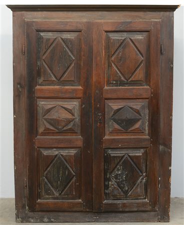 Armadio in noce a due ante pannellati. Piedi ferini stilizzati. Piemonte, secolo XVIII (cm 150x203x60) (difetti e restauri)