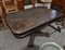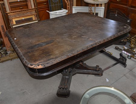 Tavolo con piano allungabile, fascia intagliata, gamba centrale sfaccettata terminante a quattro piedi sagomati poggianti su base piatta (cm 150x80x120) (difetti e mancanze)