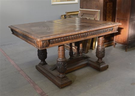 Tavolo da pranzo con piano allungabile, fascia intagliata a unghiature,...