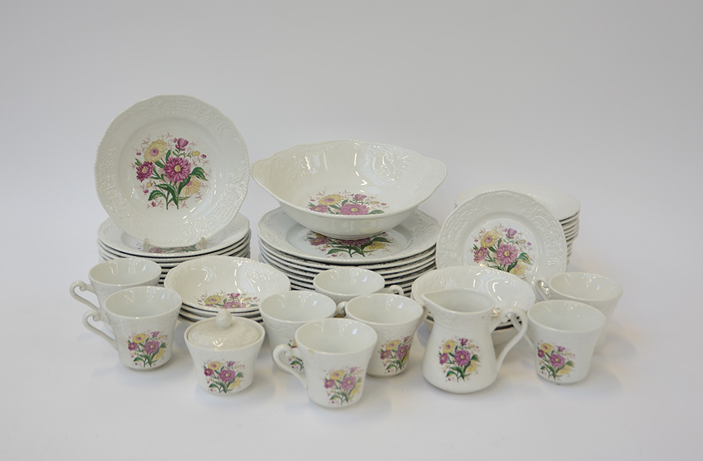 Manifattura italiana Laveno. Parte di servizio in porcellana bianca decorato in policromia a fiori composto da numerosi piatti, tazze e ciotole (difetti)
