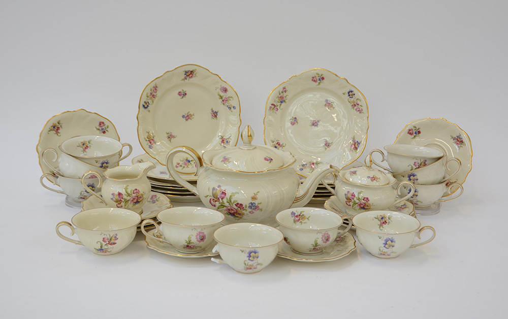 Manifattura tedesca. Servizio da tè in porcellana policroma decorata a fiori...