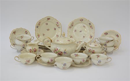 Manifattura tedesca. Servizio da tè in porcellana policroma decorata a fiori composto da teiera, lattiera, zuccheriera, undici tazze con dieci piattini e dodici piattini da dolce (difetti)